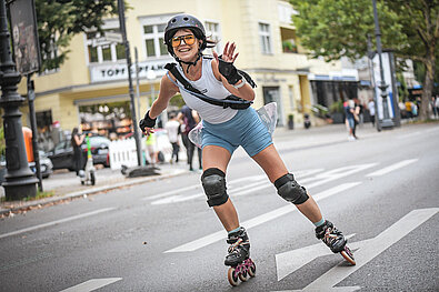 Auf der 10 Kilometer langen Inlineskating-Strecke der adidas Runners City Night lasst ihr euch von der grandiosen Stimmung in den Sonnenuntergang tragen. Erlebt eine einmalige Sportparty auf Rollen.